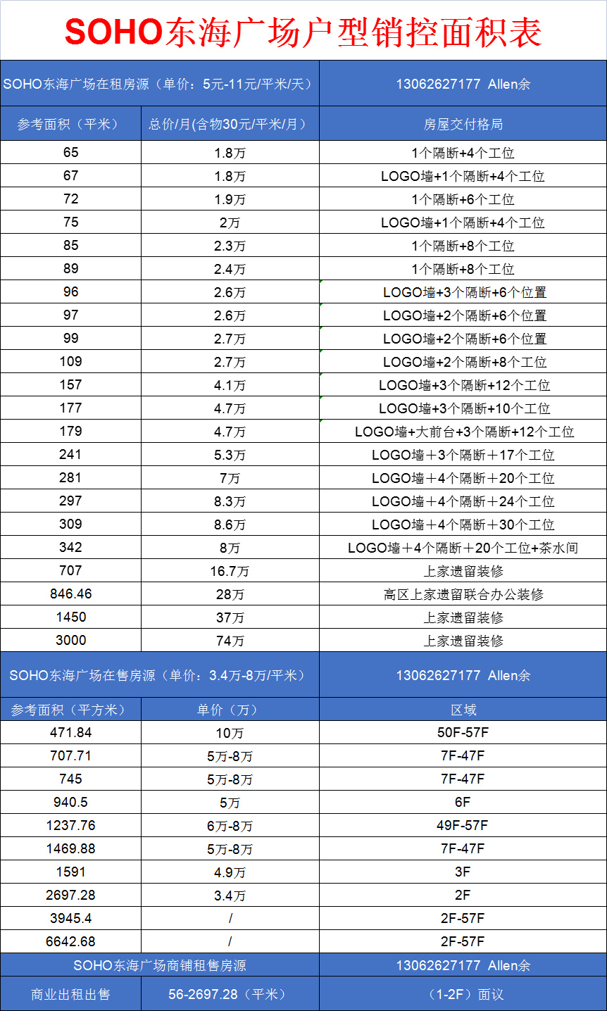 SOHO东海广场地处上海南京西路中央商务区中心位置,总建筑面积为80510平米,其中写字楼面积为67829平米,目前入驻的企业95%以上均为国内外知名公司;1-2层为商铺,建筑面积为3842平米。